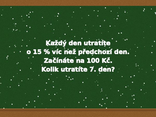 Práce a vzděláníKaždý den utratíte o 15 % víc než předchozí den. Začínáte na 100 Kč. Kolik utratíte 7. den?14. dubna 2026