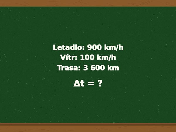 Práce a vzděláníPříklad: Letadlo letí 900 km/h proti větru 100 km/h. O kolik minut déle trvá 3 600 km než po větru?17. dubna 2026