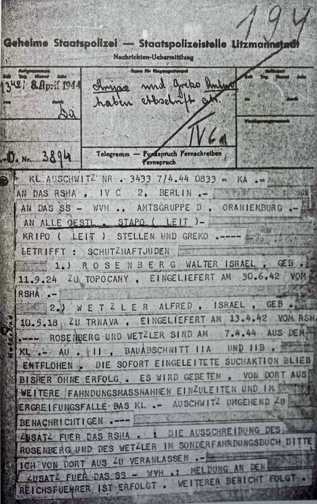 Telegram z 8. dubna 1944 od gestapa v Osvětimi v Polsku s popisy Rudolfa Vrby a Alfreda Wetzlera, dvou uprchlíků, adresovaný ústředí říšské bezpečnosti v Berlíně, SS v Oranienburgu, okresním velitelům a dalším osobám.