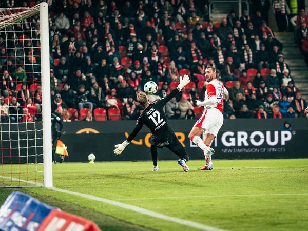 Sparta vstoupila do utkání sebevědomě, s jasnou převahou v držení míče i větší stabilitou ve hře. První výraznější šanci měl překvapivý člen sestavy Garang Kuol. Australský křídelník vypálil nebezpečnou přízemní střelu, která minula levou tyč Floderovy brány jen o pár centimetrů. Rudí pokračovali v souvislém tlaku, přibývalo rohů i zajímavých akcí. Ve 20. minutě přišel klíčový moment duelu. Sparta po dalším obléhání vápna rozehrála roh nakrátko a Rynešův centr zastavila ruka Langhamera v jasně nepřirozené poloze. Rozhodčí bez váhání ukázal na penaltu. Haraslín zachoval chladnou hlavu a poslal míč k pravé tyči.