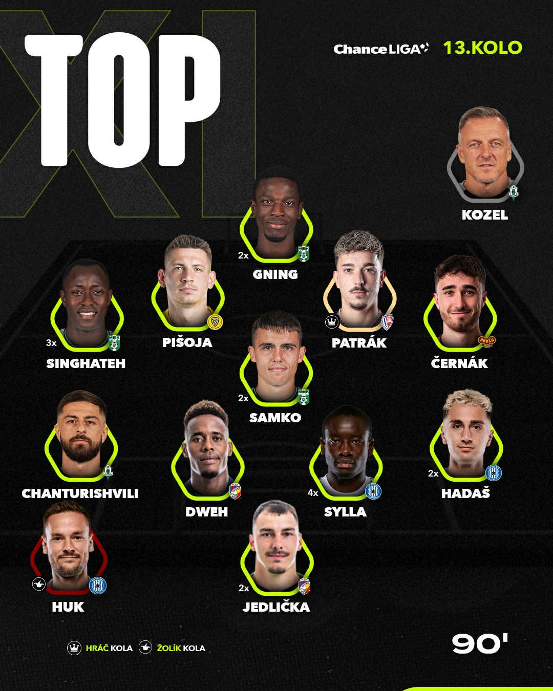 V pětičlenné záložní řadě nemůže chybět Ebrima Singhateh. Na porážce trápící se Mladé Boleslavi se karvinský křídelník podílel hned dvěma asistencemi. Po jeho nahrávkách se prosadili Emmanuel Ayaosi a Denny Samko. Ten rozvlnil mladoboleslavskou síť hned dvakrát a zažil dost možná nejpovedenější zápas své dosavadní ligové kariéry. Oba hráči se podíleli na drtivé výhře Karviné, která svého soupeře přehrála 4:2.