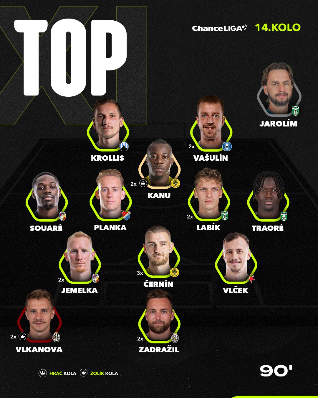 Vedle Černína má zlínský fotbal dalšího zástupce v sestavě kola. A nejen zástupce, ale rovnou hráče kola. Je jím Nigérijec Stanley Kanu, který Jablonci vstřelil hned dvě branky. Stejně jako jeho spoluhráči vytěžil z minima maximum a předvedl velkou efektivitu. Zbývající dvě místa v záloze patří karvinským hráčům - Albertu Labíkovi a Abubacarovi Traorému. I díky ním předvedla Karviná proti Spartě dominantní výkon a ze zápasu si odnáší šokující tři body. Druhý jmenovaný k nim navíc pomohl přesnou trefou.