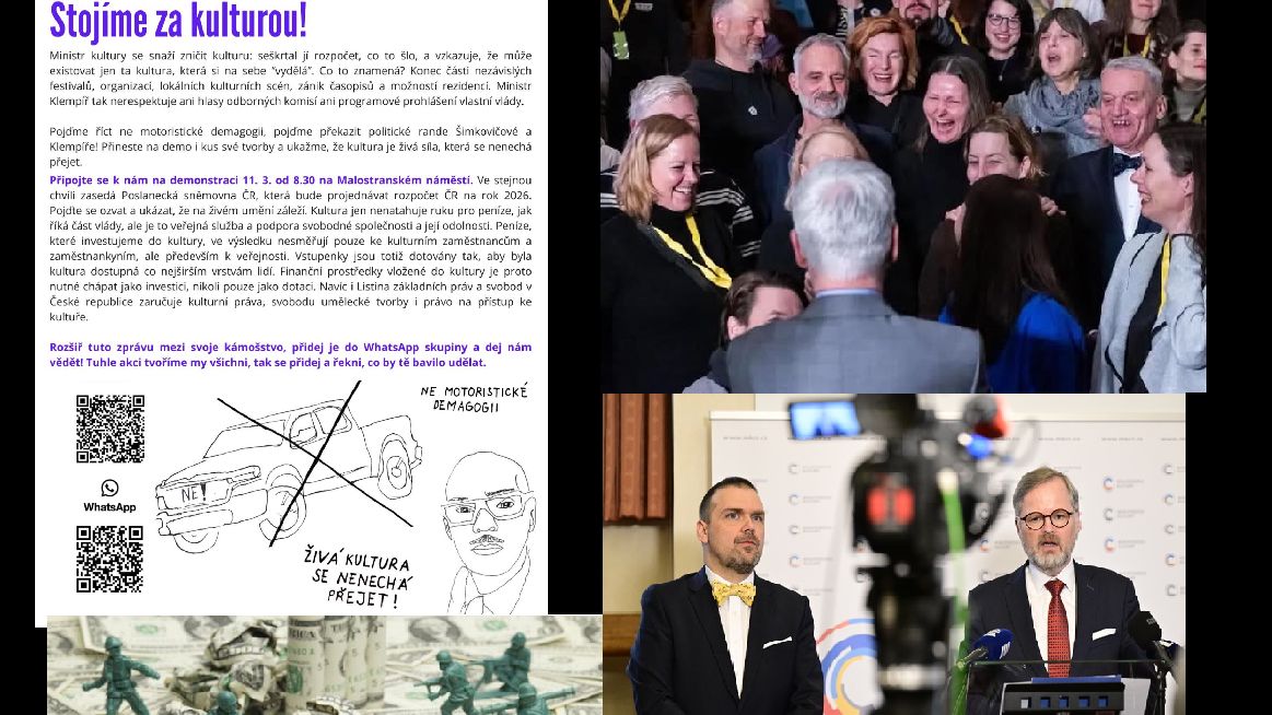 A do tohoto tedy má nějak vstupovat „kultura“, která je „podpora svobodné společnosti a její odolnosti“, jak hlásá leták „Stojíme za kulturou“ zvoucí k protestu 11. 3.? Vždyť drtivá většina českých „kulturních“ a „uměleckých“ lidí mlčky či aktivně podporuje takovou protilidovou politiku, která je popsána výše.