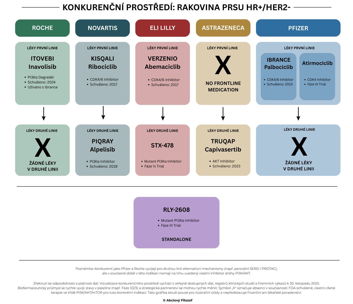 Na jedné straně tento krok validuje obrovskou hodnotu a vědeckou tezi alosterické inhibice PI3Kα – tedy přesně tu sázku, kterou činí i Relay. Na straně druhé to staví Relay do pozice Davida proti Goliášovi, kdy proti ní stojí konkurent s prakticky neomezenými zdroji na marketing a klinický vývoj. Tato akvizice je jasným signálem, že Big Pharma vnímá selektivní inhibici jako budoucnost tohoto oboru.