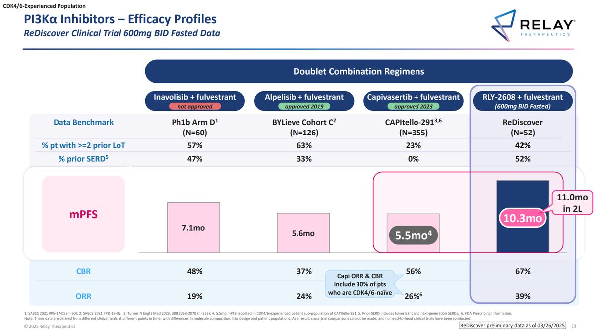 Zatímco Eli Lilly po akvizici stále integruje program do svých struktur a nachází se ve fázi 1/2 vývoje (studie Pikalo-2), Relay Therapeutics již aktivně nabírá pacienty do své registrační fáze 3 (ReDiscover-2).