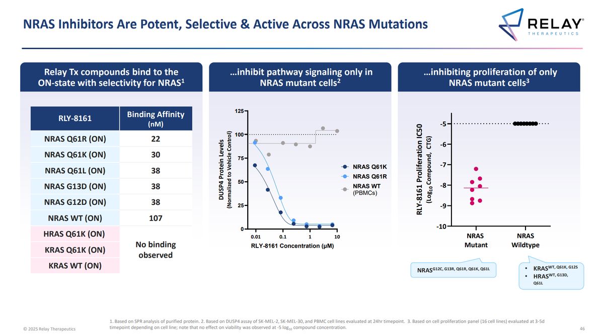 Relay Therapeutics odhalila molekulu RLY-8161, která v předklinickém testování vykazuje vysoce slibné vlastnosti. Data potvrzují, že se molekula váže silně a výhradně na zmutovaný NRAS, zatímco ostatní izoformy RAS (KRAS, HRAS) a zdravé buňky efektivně ignoruje.