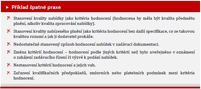 Metodika udává kromě příkladů dobré praxe i tu špatnou. V tomto případě (viz Obrázek 4.) zmiňuje stanovení kritérií jako kvalita nabídky a kvality nabízeného plnění. Podmínky kvality jako kritéria musí být stanovena velmi přesně, aby zadavatel rozuměl, co tím zadavatel myslel a co jsou jeho kvalitativní požadavky. Kritérium kvality nabídky je pak neuchopitelný pojem, kdy se předpokládá, že nabídka má všechny náležitosti, které potřebuje zadavatel (a upravuje ZZVZ) pro posouzení nabídky. Nekvalitní nabídka by v tomto případě znamenala, že neobsahuje všechny náležitosti a zadavatel může vyzvat účastníka k doplnění (pokud to časový rámec zakázky dovolí).