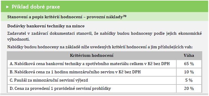 Metodika také udává příklady dobré praxe (viz Obrázek 3.). Většina zadavatelů nastavuje jako jediné kritérium pořizovací cenu, což není vždy výhodné pro naplnění cíle zakázky a principů 3E. Jedná se především o nákup předmětu, který má některé unikátní vlastnosti, s jeho používáním se pojí další provozní náklady (např. servis nebo použití jednorázového spotřebního materiálu) apod. Na obrázku č.3 můžeme vidět nastavení kritérií pro výběr předmětu zakázky s přidáním váhy na další kritéria mimo pořizovací cenu předmětu zakázky jako je cena mimozáručního servisu (za 1 hod.), paušál pro servisní výjezd a cena za pravidelné servisní prohlídky.