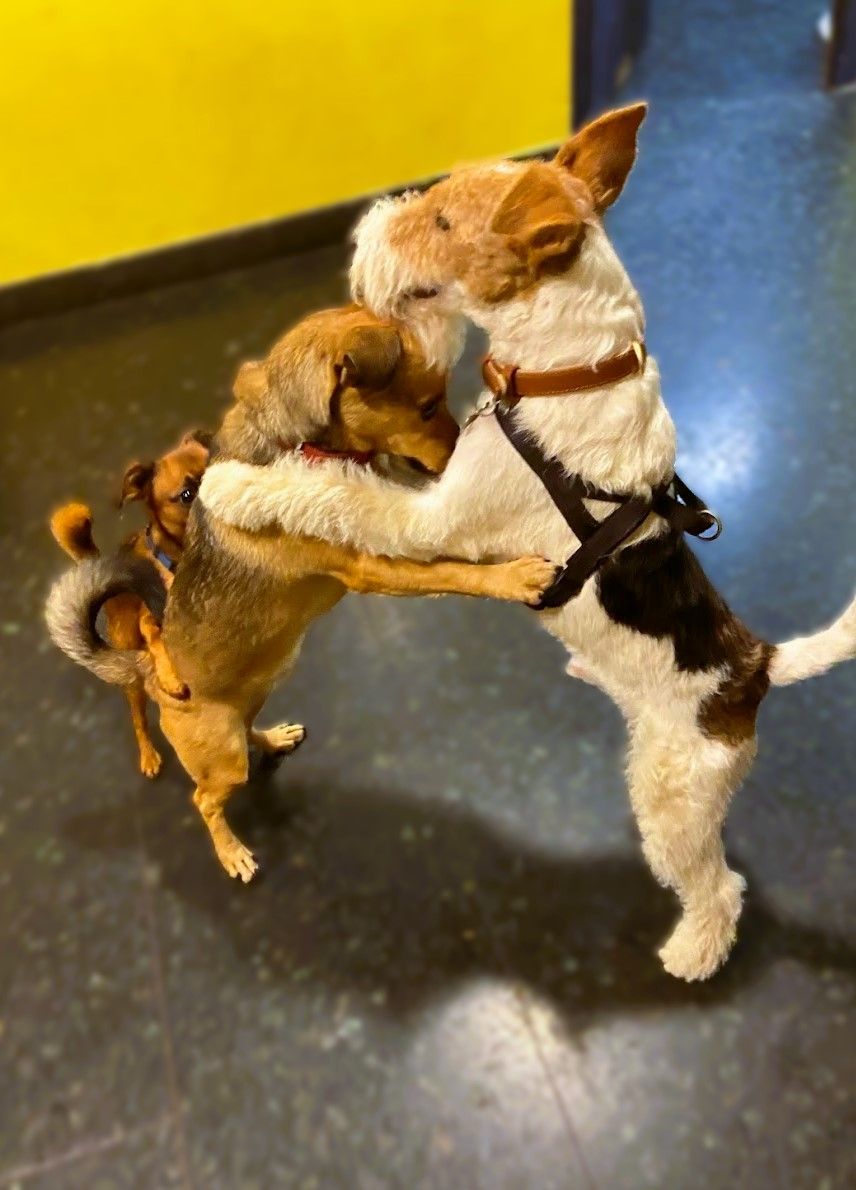 Ovšem někteří psi vběhli ráno do herny jako divé šelmy, oběhli všechny kámoše a rovnou se pustili do honiček a zápasů. Tím nemyslím zápasy se zlým úmyslem, ale více či méně brutální hrátky s okusováním, taháním za ocas a, jak tomu říkám, boxing nebo zápas volným stylem.