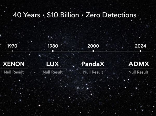 Mainstream strávil desítky let hledáním neviditelné hmoty. XENON1T, LUX, PandaX, ADMX — každý experiment citlivější než předchozí. Výsledek? Zatím bez přímé detekce.