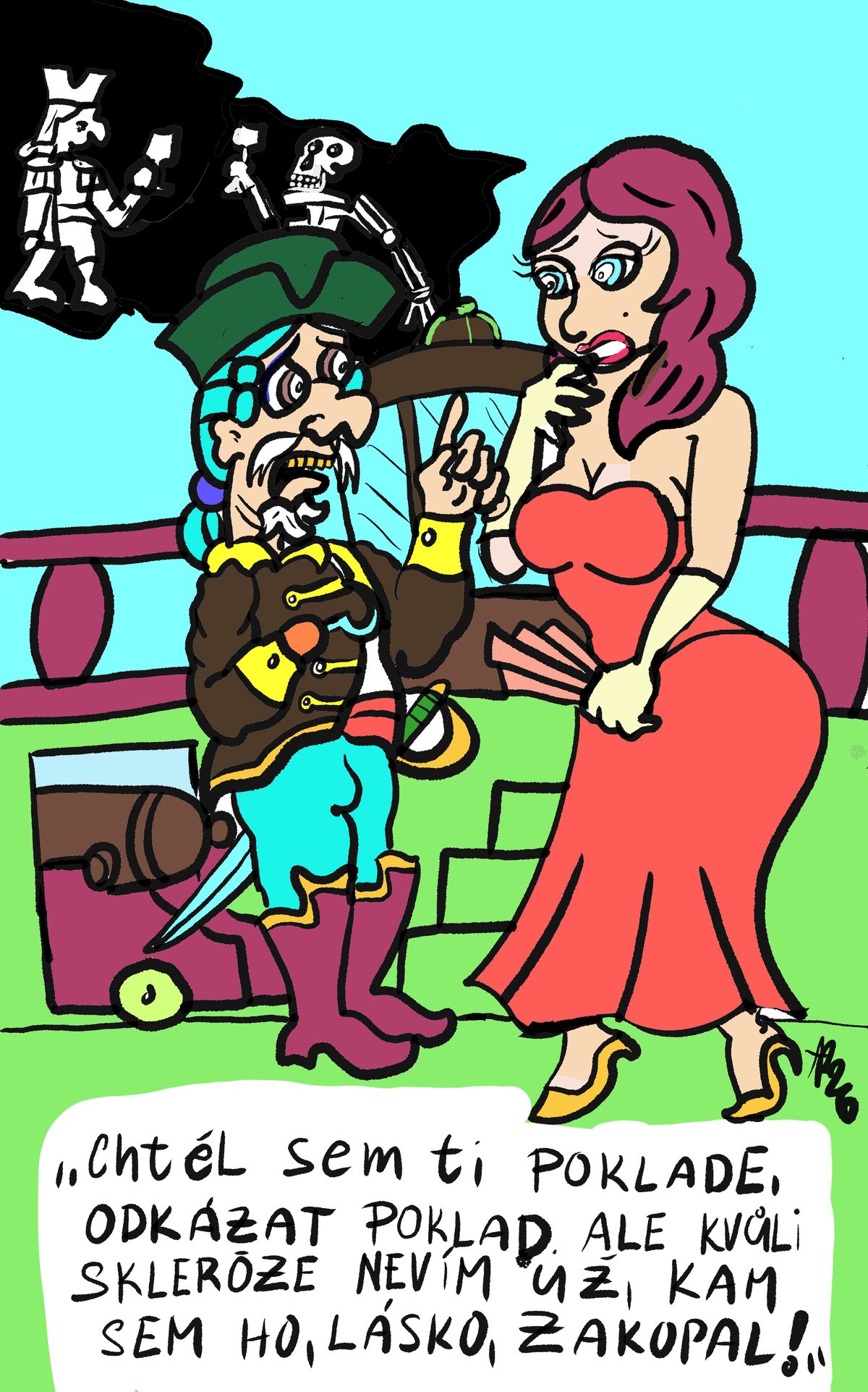 „Chtěl jsem ti, Poklade,odkázat poklad, ale kvůli skleróze,už nevím,Lásko,kam sem ho zakopal…“