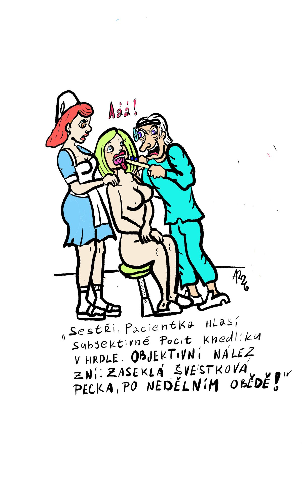 „Sestři, pacientka hlásí subjektivně pocit knedlíku v hrdle. Objektivní nález zní: zaseklá švestková pecka,po nedělním obědě!“