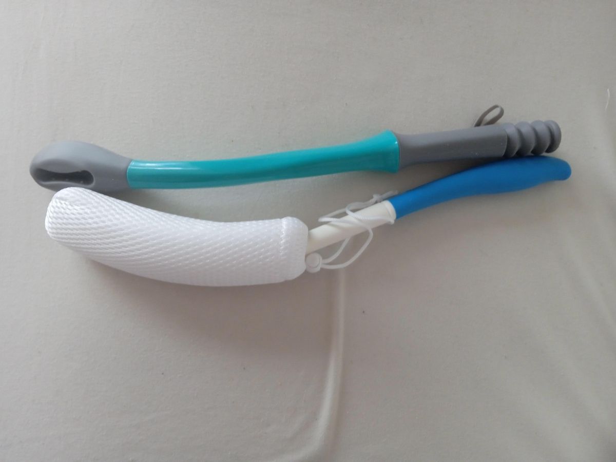 První pomůcka na obrázku se používá na utírání toaletním papírem. Do otvoru se vloží papír a po použití se zmáčkne konec tyče a papír vypadne. Druhá pomůcka se používá při sprchování.