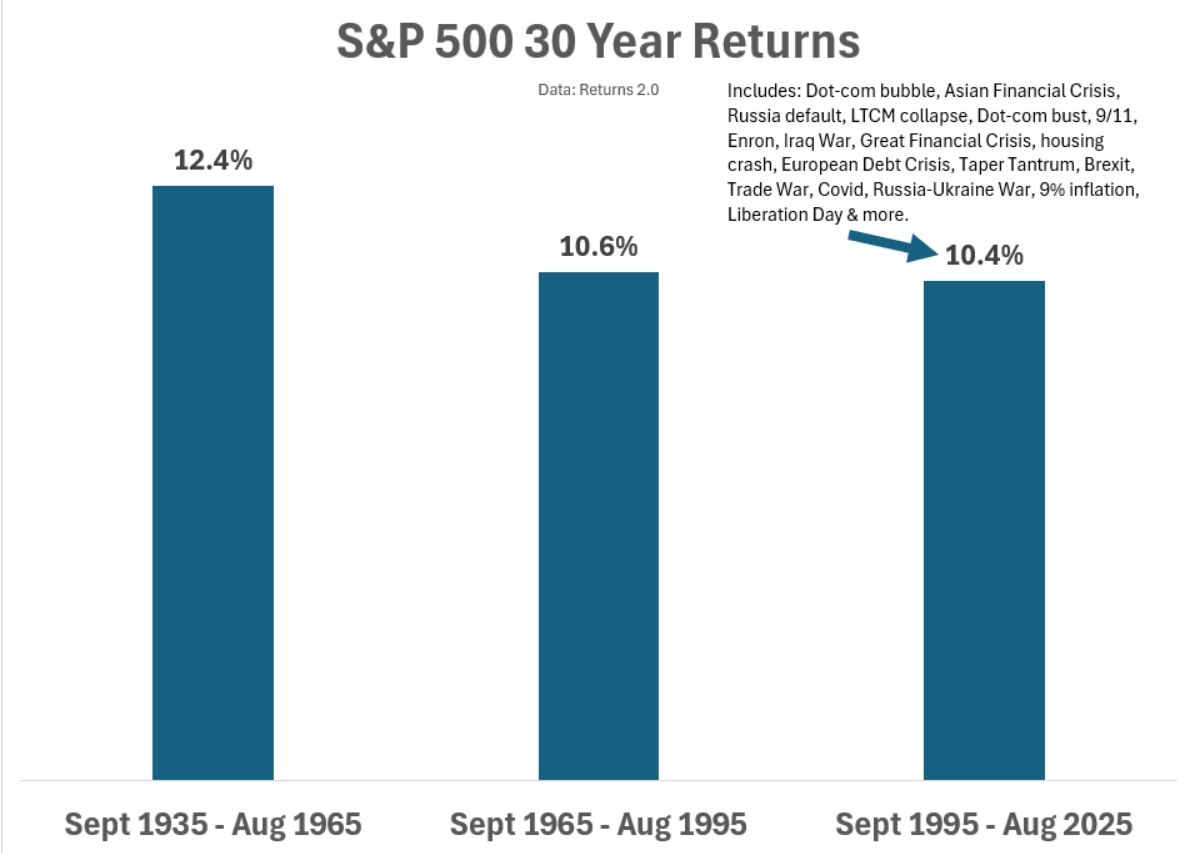 Za poslední tři dekády si americký akciový trh prošel mnoha krizemi, ale i tak v průměru ročně rostl o více než 10 %. Dokonce ještě lepší výsledky vykázal trh v předchozích dvou třicetiletých obdobích. Války, pandemie, etapy prudké inflace, bankroty velkých firem i mnoha zemí ve světě. Nic z toho trh nedokázalo zastavit, pouze přibrzdit. I přes obrovské otřesy zůstávají investice do lidské vynalézavosti jednou z nejjistějších dlouhodobých cest k ochraně hodnoty majetku, respektive jejímu zvyšování.