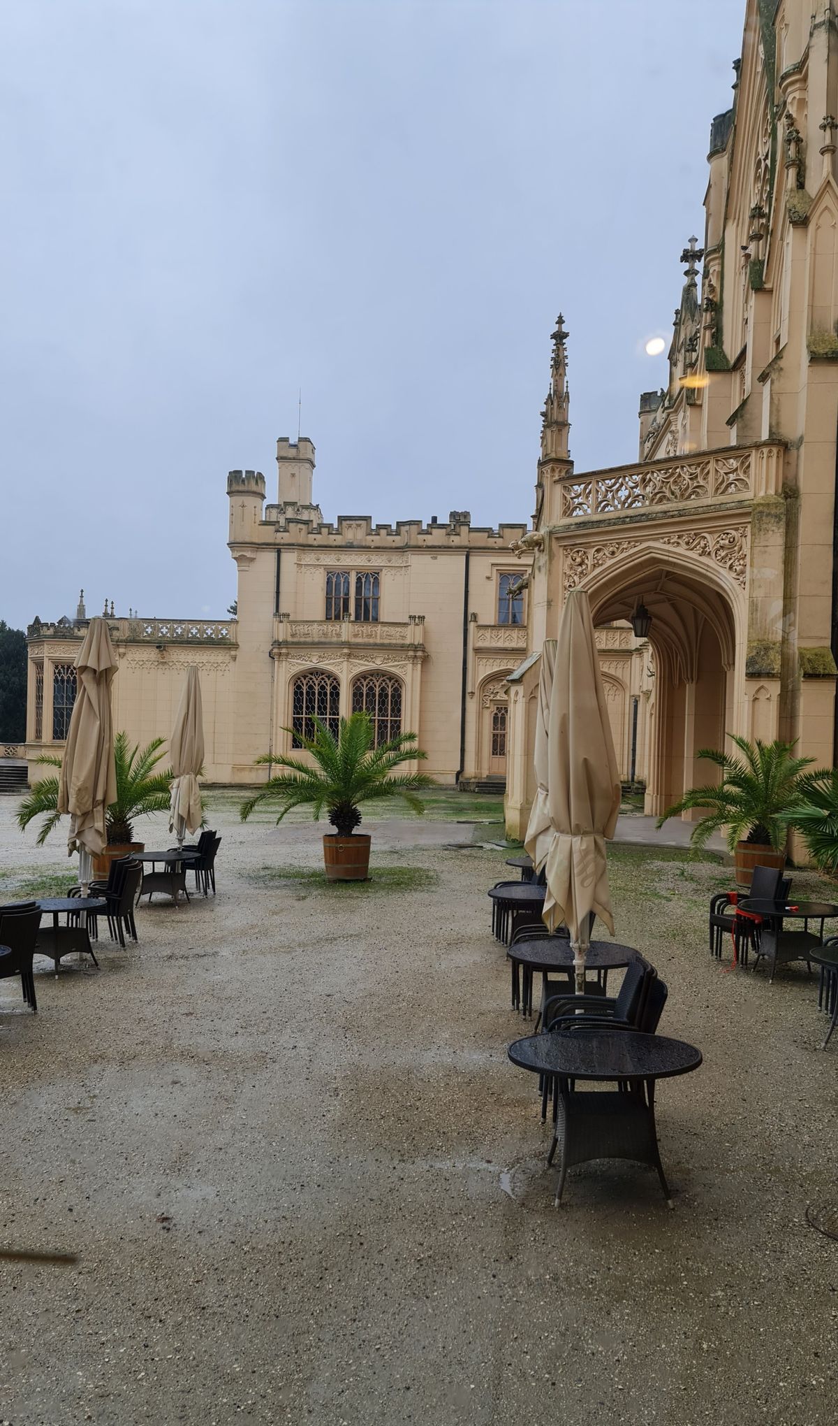 Šli jsme se projít po Lednici, zjistit otvírací dobu zámku, který jsme hodlali navštívit další den, a k naší velké spokojenosti jsme natrefili na lahodný burčák. Když jsme se druhý den bohužel již s deštníkem vraceli z prohlídky zámku, kdy jsme plánovali odjet, číhal na nás opět onen asi důchodce a chtěl další, už třetí stovku za necelých 24h. Co na to říct. Byl to vynalézavý Čech a jeho „den“ měl prapodivný počet hodin. Hned vedle tohoto dvorku byla další soukromá parkoviště, která nabízela malinko dražší parkování, ale bez překvapení.