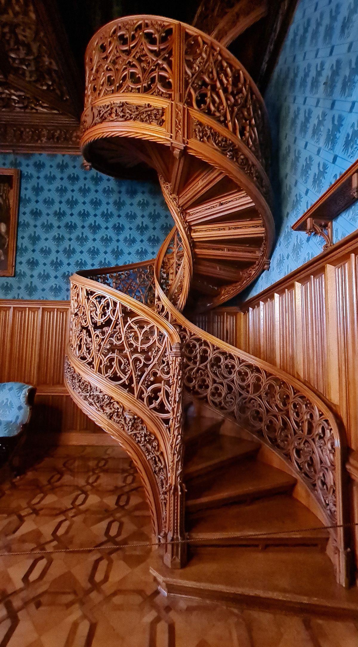 Vřetenové schodiště v zámecké knihovně vyrobené z jednoho stromu