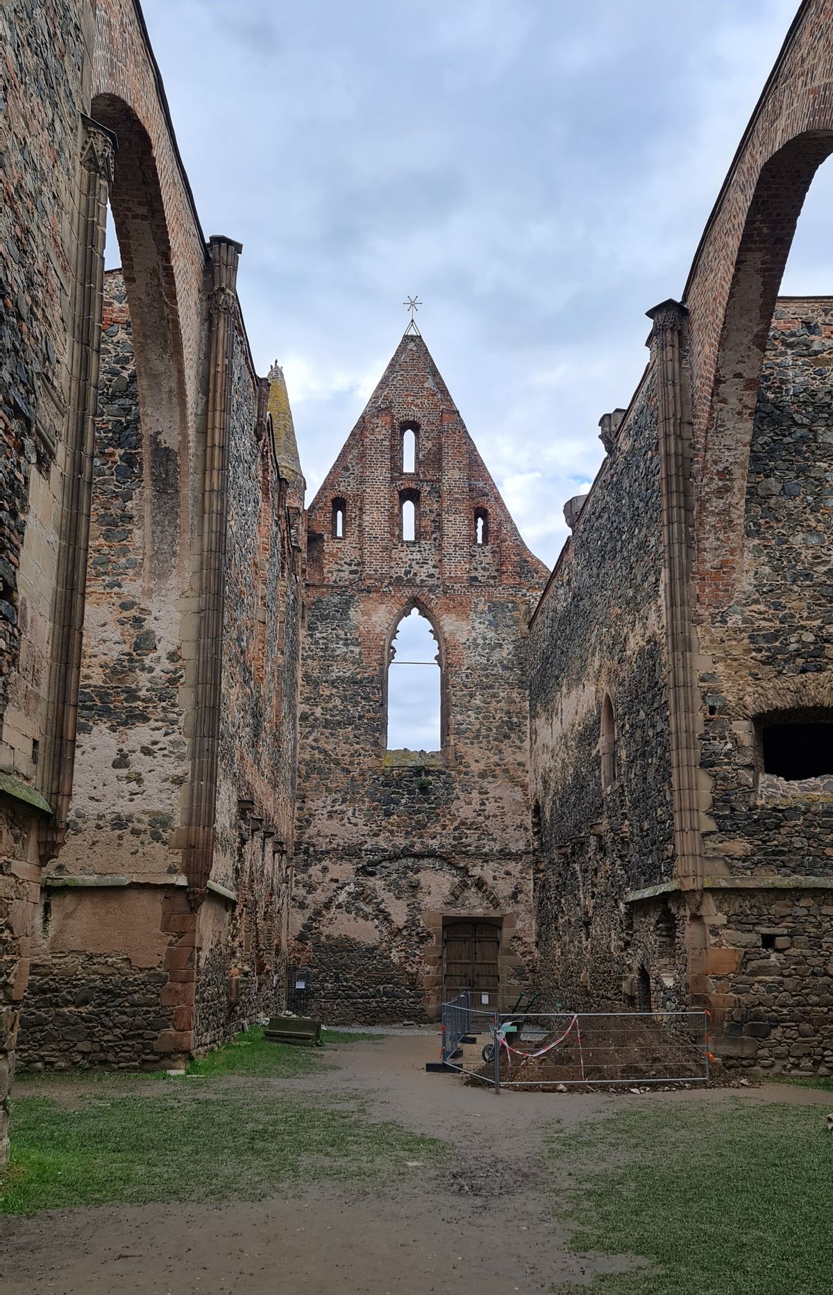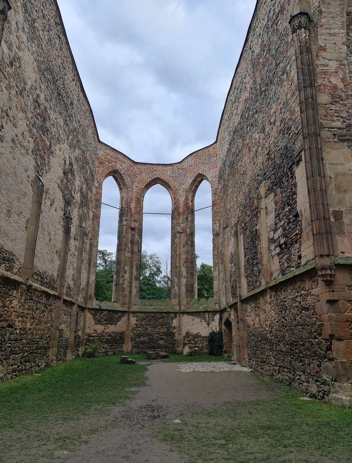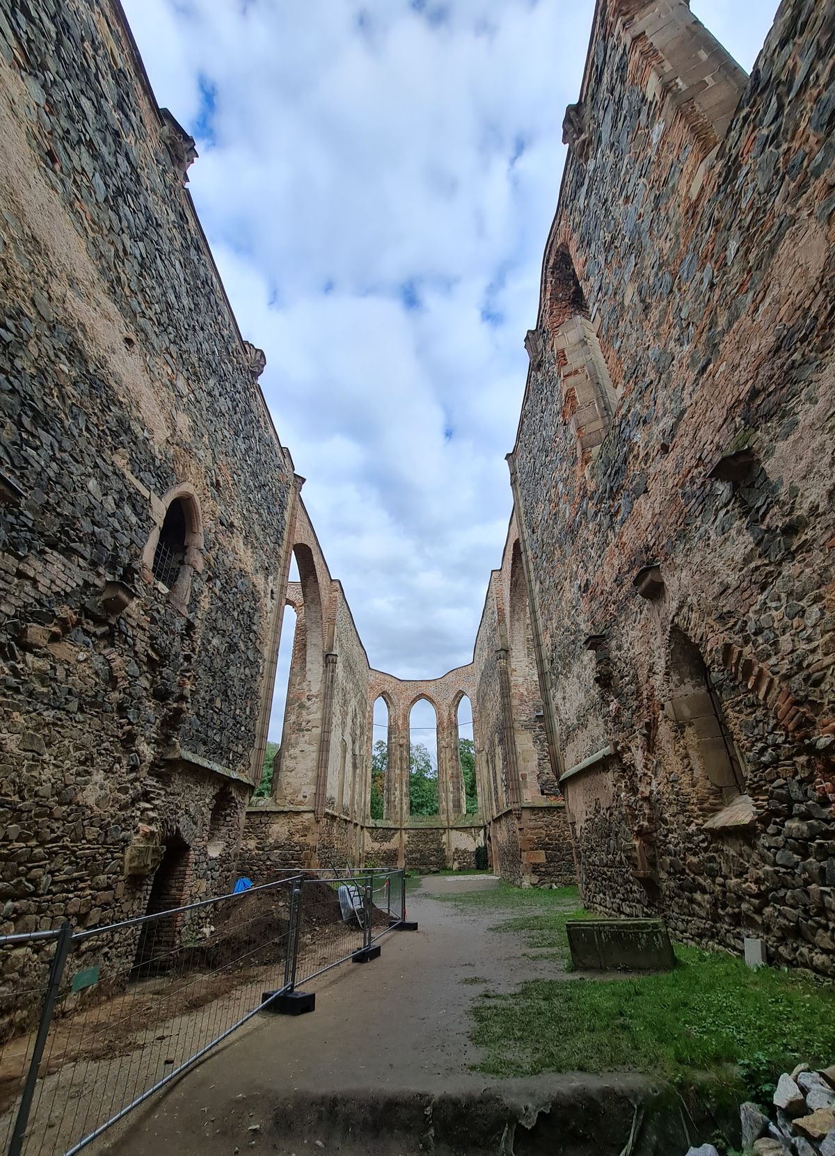 Po zakoupení vstupenky a zapůjčení krátkého textového průvodce za kauci 50,- Kč jsem se vydala vzhůru za romantikou a objevováním. Pomalu jsem vstoupila vysokými starými dřevěnými dveřmi do historie. Přede mnou se otevřel rozlehlý prostor hlavní lodi kláštera s nebem místo střechy ohraničený jen vysokánskými kamennými zdmi ve tvaru kříže. Jen jsem tam chvíli stála, úplně sama, pohlcena tím tichem, které se rozprostřelo přede mnou. Užasle jsem hltala pohledem prostor vymezený jen gotickými klášterními zdmi. Pomalu jsem se začala procházet a prohlížet, co dokázali naši předkové postavit tak, že to přetrvalo staletí. Bohužel díky výzkumným pracím je část u vstupu do Rajské zahrady ohraničena a nepřístupná.