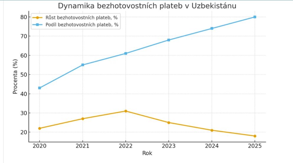 Na pozadí zrychlené digitalizace bankovního sektoru dosáhl podíl bezhotovostních plateb v Uzbekistánu téměř 80 %. Růst zůstává stabilním faktorem fintechových reforem.