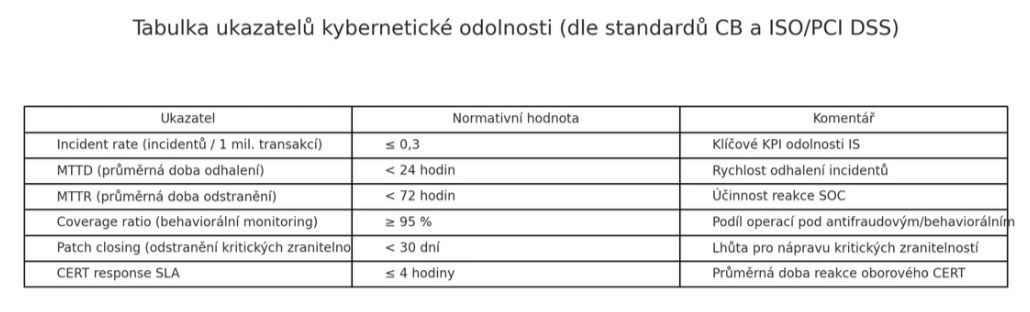 Uvedené hodnoty jsou cílovými benchmarky používanými v praxi informační bezpečnosti (ISO 27035/NIST/PCI DSS) a v interních SLA bank. V minimálních požadavcích na IS a kyberbezpečnost komerčních bank (Ministerstvo spravedlnosti, reg. č. 3669 z 18.–19. 08. 2025; účinnost od 20. 11. 2025) jsou stanoveny procesy řízení zranitelností (skanování, hodnocení dle CVSS, patch management), zatímco konkrétní lhůty nápravy (např. < 30 dní pro kritické nálezy) se ukotvují v interních politikách banky a dohodnutých SLA.