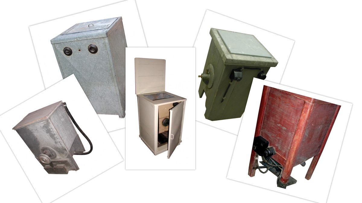 Vlevo pračka Hoover 0307 z roku 1948, vpravo pračka domácí výroby kolem roku 1950.