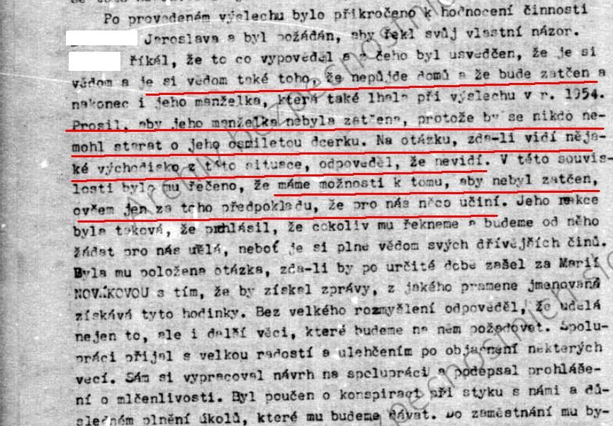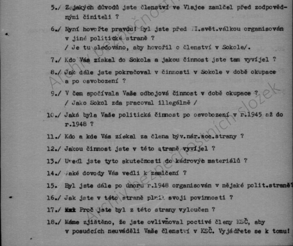 Měli přesně naplánovaný scénář rozhovoru, kdy ho nejprve vyzvou, aby hovořil o svém životě, a budou ho postupně konfrontovat s fakty, která jim nepochybně zamlčí (členství v Sokole, členství ve Vlajce do roku 1940, členství v nár. soc. straně, krátké členství v KSČ, kdy byl vyloučen pro neplacení příspěvků, pokus o sebevraždu před několika lety, několik nevěr, prodej pašovaných hodinek kolegovi). Šetření tedy muselo být opravdu důkladné, aby StB nasbírala tolik informací.