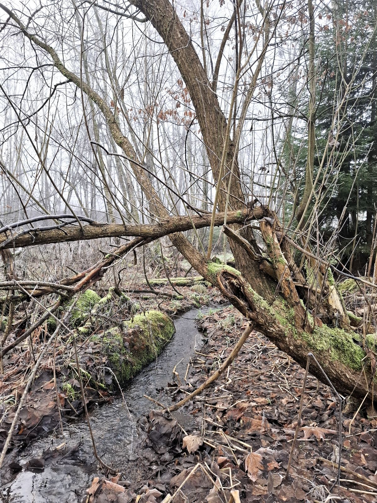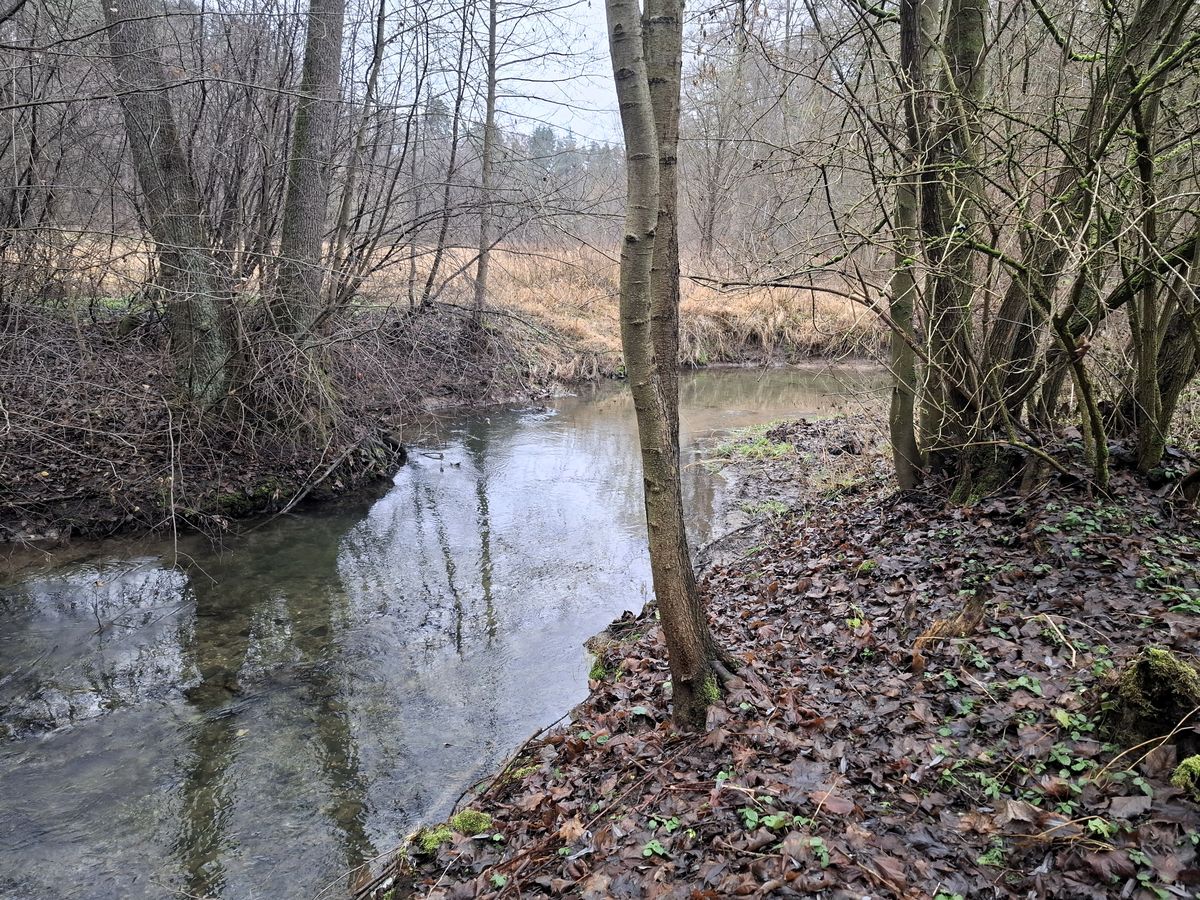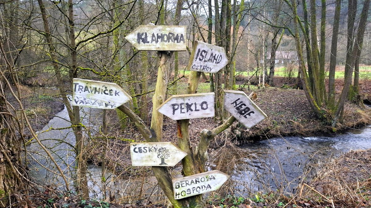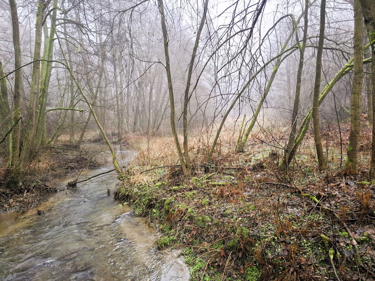 „To sis zase něco vymyslela!“ Žbrblala jsem si a přemýšlela, jestli pramen vůbec najdu. Podle mapy to vypadalo na dvě místa, kde pramení. Obávala jsem se, že se ale nedostanu ani k jednomu. Pramen vpravo od cesty jsem odpískala i v místě. Uzavřené prostranství, stavby, tam to nešlo. Ten vlevo se zdál, že je v nějakých mokřinách. Když jsem tam dorazila, u silnice to vypadalo částečně jako skládka, částečně to bylo rozježděné. Ale stromy tam byly. Kdyby nebylo zimní období, celé místo by bylo asi zarostlé. Odvážně jsem překročila nějaké rozbité lahve a zkusila se ponořit mezi kmeny stromů.