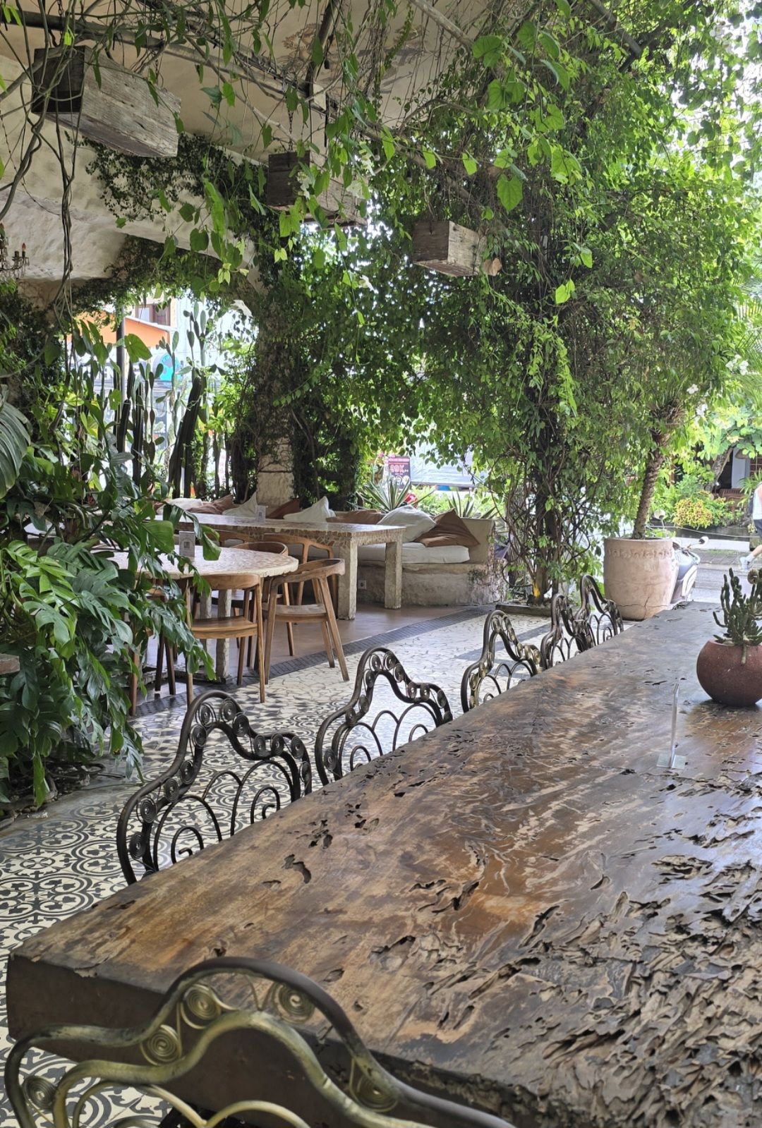 Stále zůstáváme v srdci Canggu, ale jakmile se vydáte do této vegetariánsko-veganské kavárny, ocitnete se na ulici, která vám bude připomínat spíše džungli než ruch města. Je až neuvěřitelné, že toto klidné místo najdete jen pár metrů od rušné hlavní ulice.