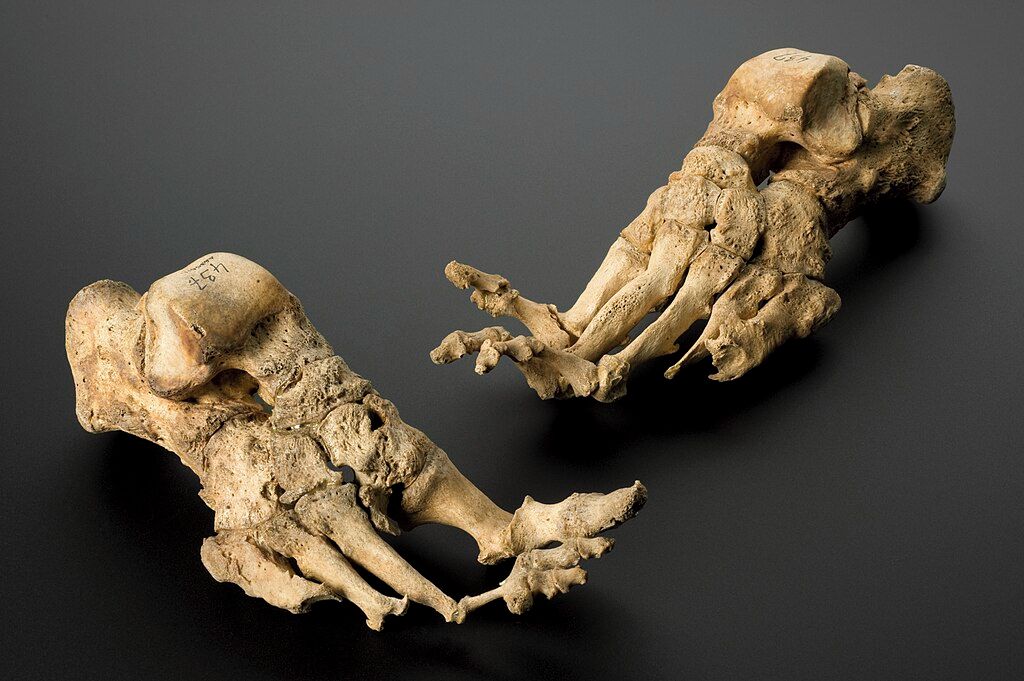 Pozůstatky lepry na kostech nebožtíka, který zemřel okolo roku 1350