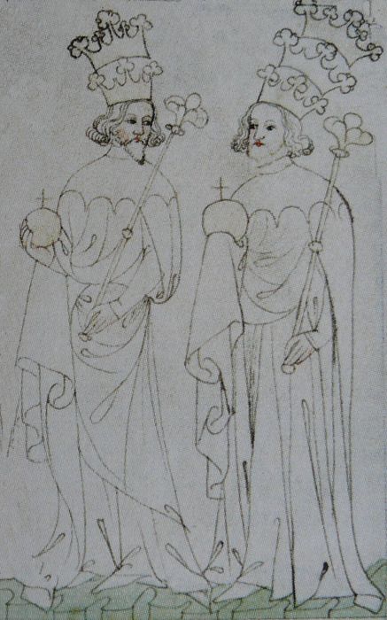 Václav II. jako král český a polský a Václav III. jako král český, polský a uherský (iluminace ze Zbraslavské kroniky)