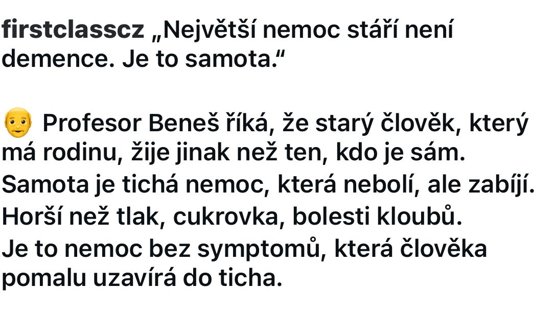 A dodala tiše: „Třeba to myslel jinak. Myslel to z pohledu života a smrti. Když člověk žije s druhým, může mu někdy zachránit život – třeba jediným telefonátem nebo první pomocí. Proto říká, že samota zabíjí.“