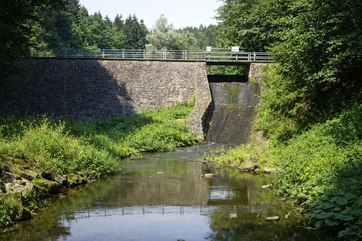 Hráz na Javornickém potoce: technická bariéra, která soustřeďuje vodu do jednoho bodu a zároveň přerušuje přirozenou kontinuitu toku.