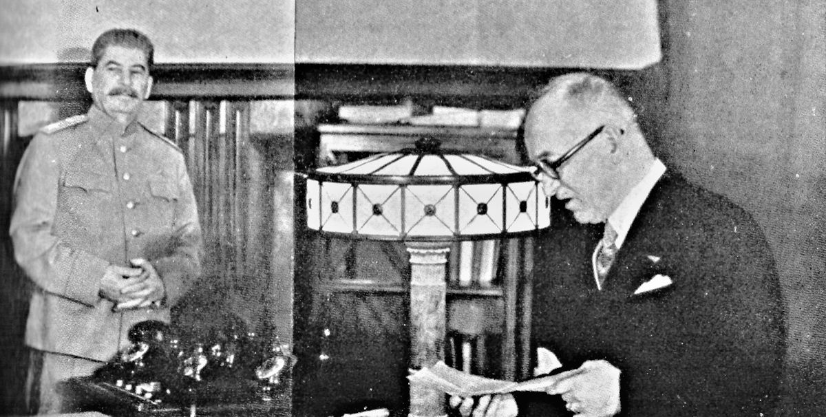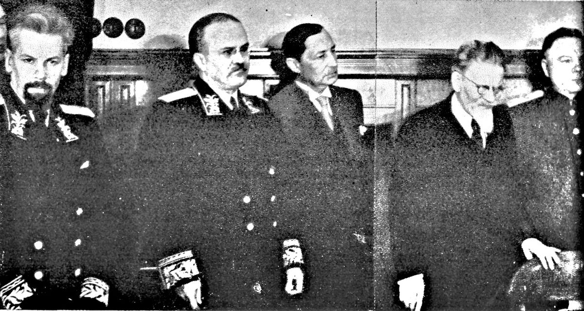 Benešova návštěva v Moskvě - sovětští činitelé přítomní také podpisu smlouvy (zcela vlevo Alexander Kornejčuk, zástupce V. Molotova)