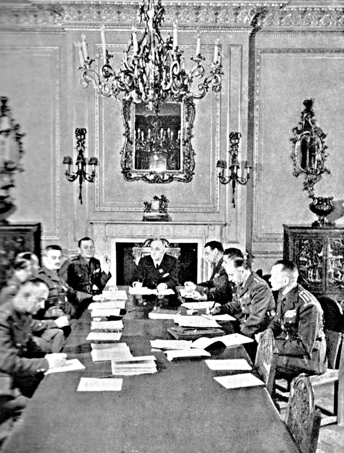 Porada prezidentových vojenských poradců - Londýn 1941; první zleva plukovník Fr. Moravec, náčelník čs. exilové zpravodajské služby