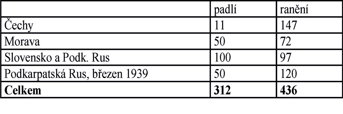 Údaje o ztrátách čsl. obránců vlasti se různí. Jeden z podrobnějších přináší údaje o ztrátách v období od 1. září 1938 do 15. ledna 1939 uchovávané v archivu MNO.