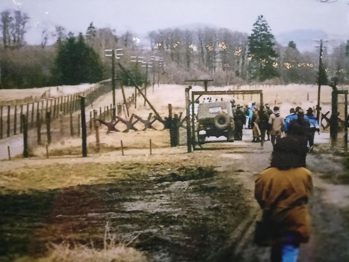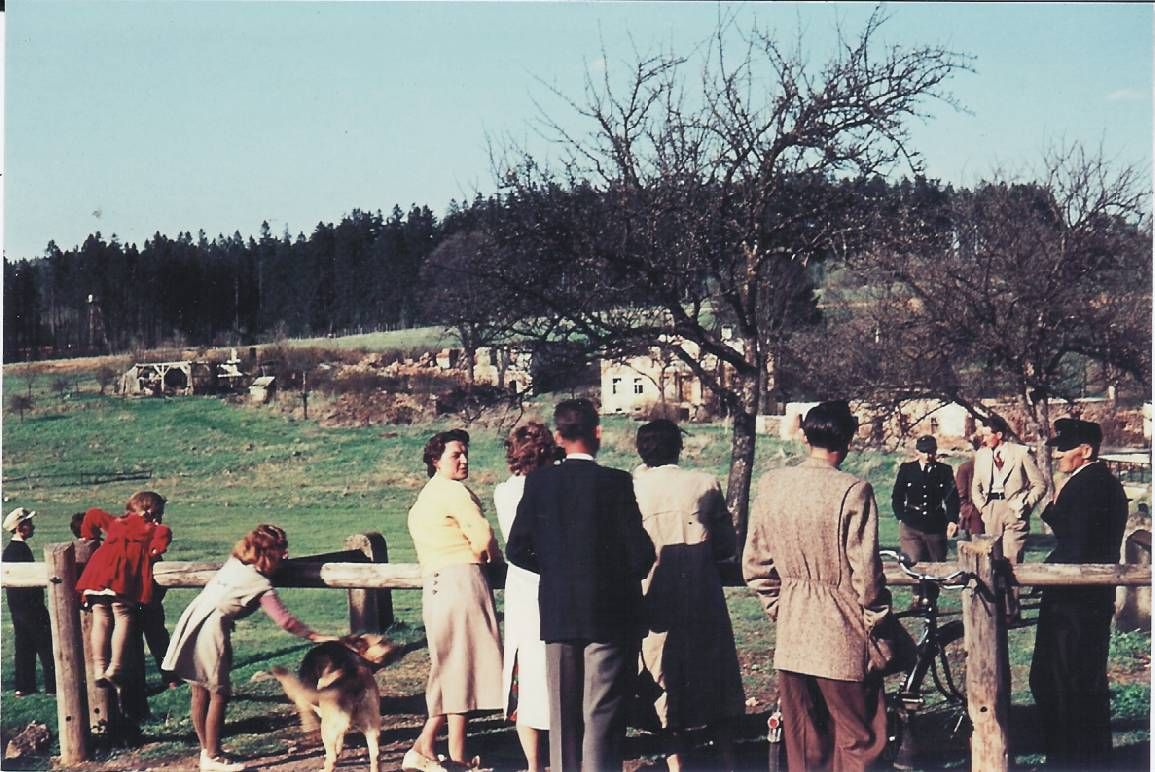 Trosky České Švarcavy při likvidaci obce v zakázaném pásmu, sledované zděšeným obyvatelstvem od závory nedaleko mostu přes říčku Schwarzach