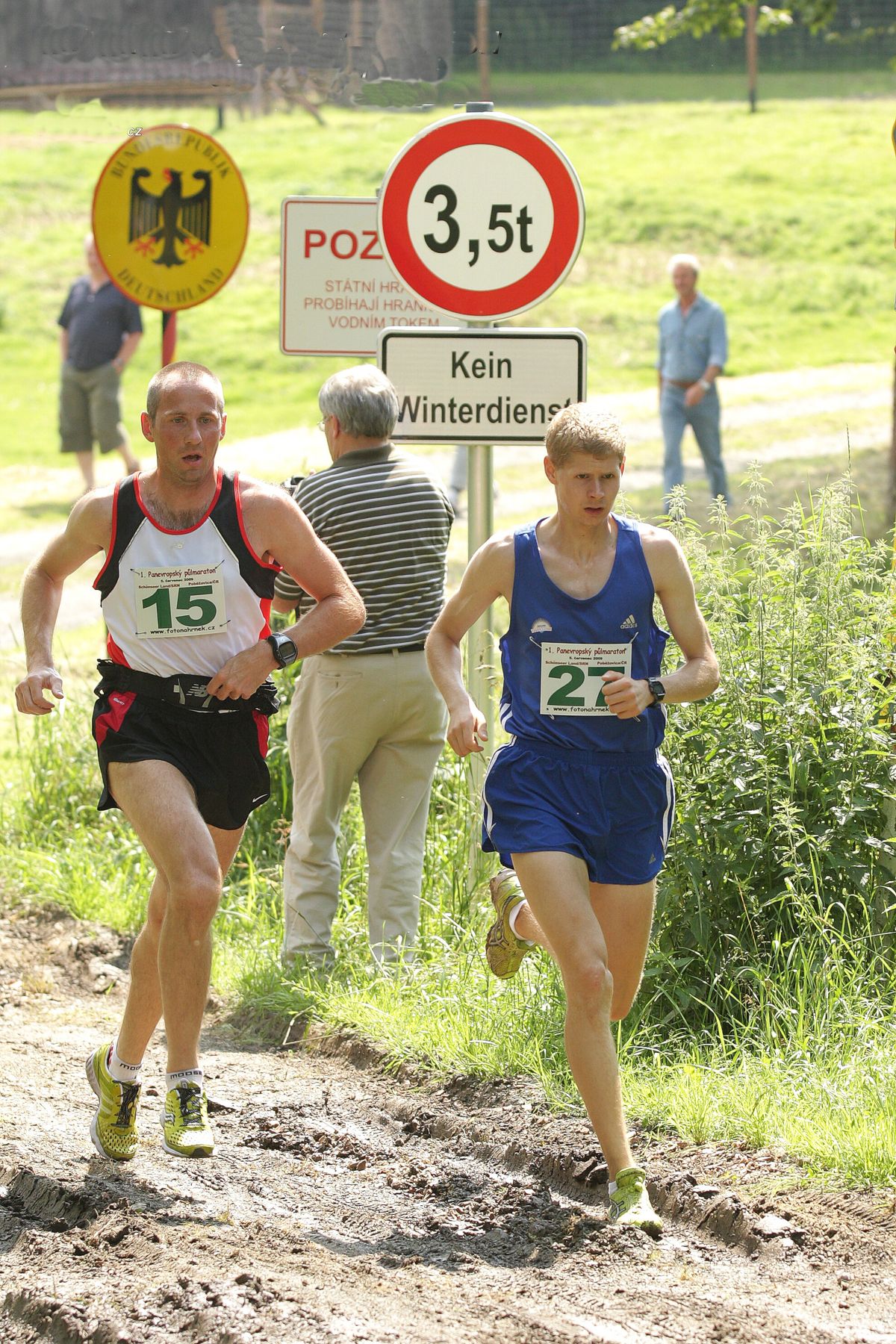 1. ročník Panevropského půlmaratónu z Německa do Česka - Právě přes hranici na mostě. Cesta ještě nezpevněná, je co dohnět!
