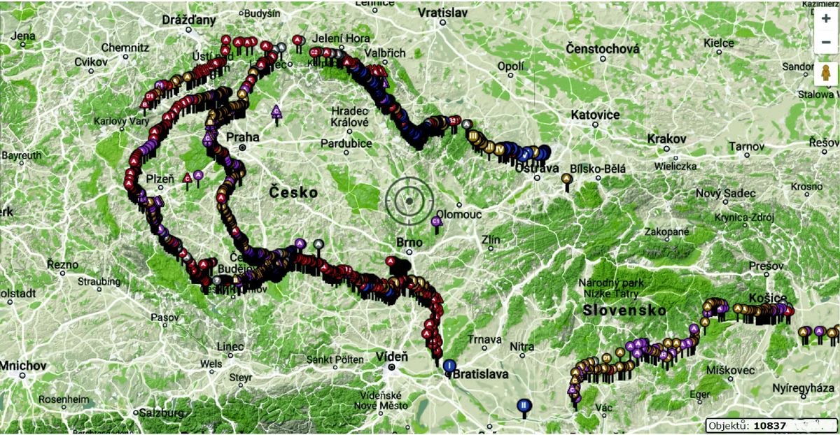 Mapa československých pevnostních pásem s barevným rozlišením jednotlivých objektů podle jejich druhu – v jejich celkovém počtu více než 10 tisíc