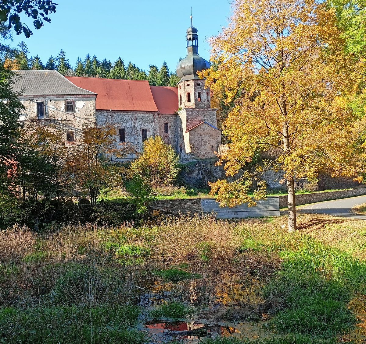 Pivoňský zámek s klášterním chrámem - zcela aktuální stav. Chrám doznává pomalých oprav, zámek chátrá dále, bažina pod zámkem bývala chovným pstruhovýn rybníkem! - 8