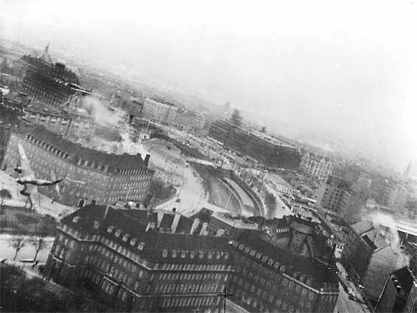 Březen 1945 - útok britských letounů Mosquito na sídlo Gestapa v Kodani (viz jeden útočící letoun na levém okraji snímku)