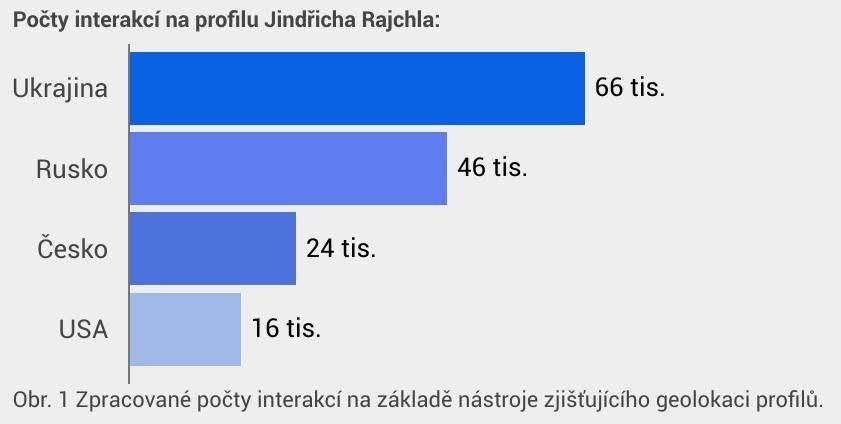 To můžeme jako Čeští elfové potvrdit, už před rokem jsme ručně prošli 200 náhodně vybraných účtů sledujících Rajchla – a zjistili, že 15–20 % z nich je pravděpodobně neautentických. Také máme k dispozici analýzu postavenou na geolokačním nástroji, která identifikovala původ interakcí. Výsledek byl jasný: většina týdenního engagementu na Rajchlově profilu nepochází z Česka, ale z Ukrajiny (včetně Rusy okupovaných oblastí) 66 tisíc, dále z Ruska 45 tisíc, pak teprve z Česka 23 tisíc a USA 16 tisíc. Pro český politický profil je to absolutně mimo normu.