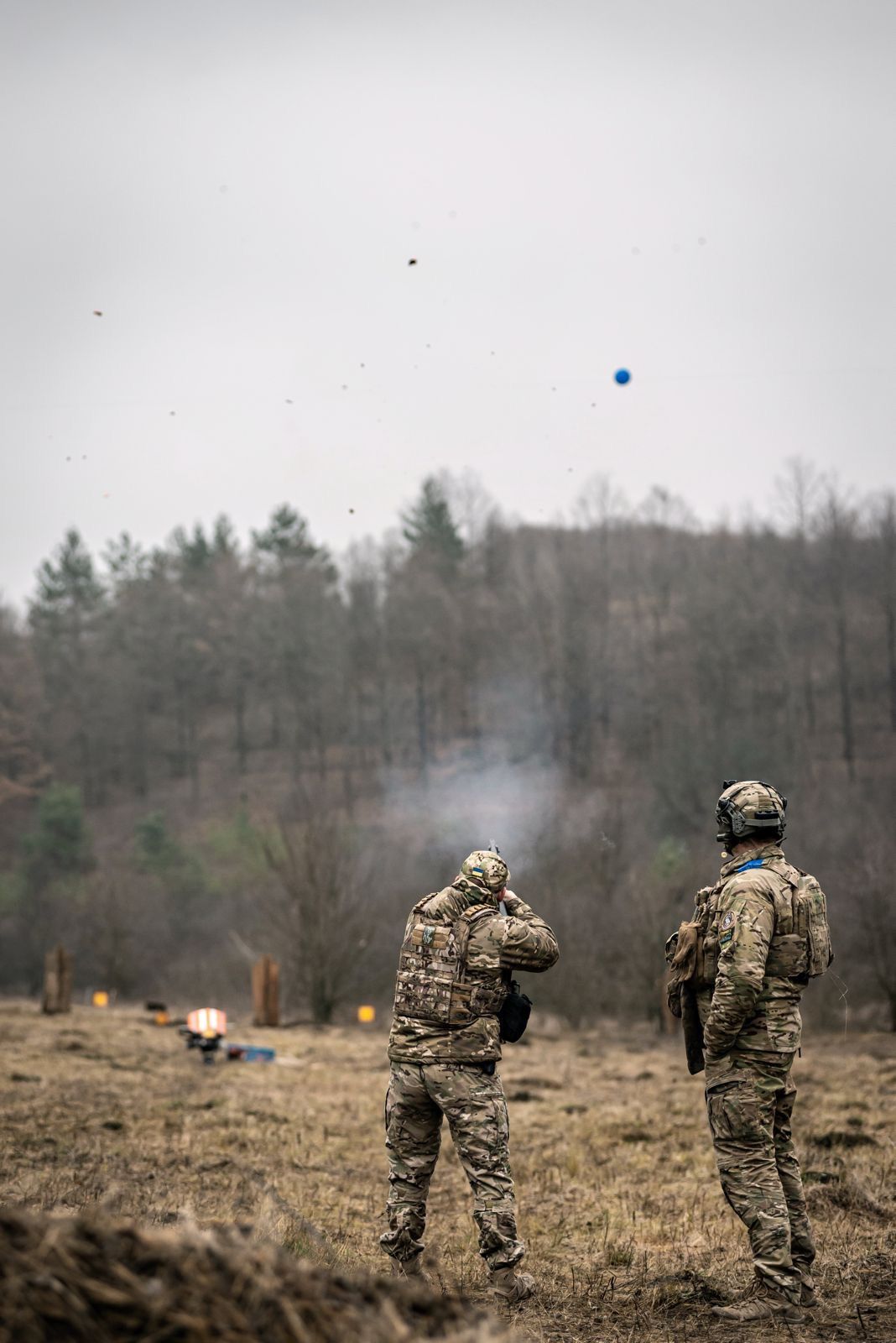Trénink ukrajinských vojáků ve střelbě z brokovnice proti dronům