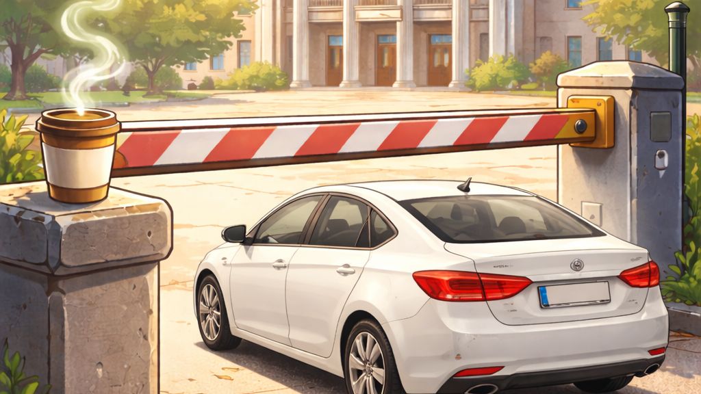 Přijel jsem k závoře a zazvonil. Ticho. Za mnou zastavilo elegantní sportovní auto, které působilo dojmem, že by mohlo stát víc než roční rozpočet menšího odboru. Čekal jsem a přemýšlel, jestli nezačne blikat. Po chvíli se ozval hlas z reproduktoru. Vysvětlil jsem, že přijíždím na výběrové řízení. Závora se zvedla a já projel dovnitř s pocitem malého vítězství.