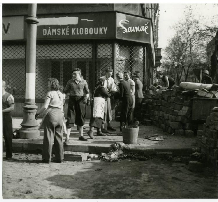 Fotografie zachycuje budování barikády během Pražského povstání v květnu 1945