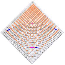 Všechny barevné body mají stejnou vzdálenost od počátku, čtyři kroky. Takže čtverec, postavený na vrchol, je kružnicí diskrétního prostoru. Vyhovuje její definici.