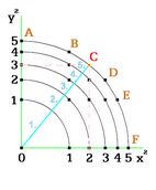 Bod C [x=2, y=3] prokazuje přesnou návaznost bodového a perspektivního zrakového prostoru. Od počátku je v obou prostorech stejně vzdálený: 5.