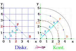 Například bod P se souřadnicemi [x=2, y=2] v bodovém prostoru se sice nachází ve spojitém (kontinuálním) Euklidově prostoru opět ve vzdálenosti 4 - jenže má jiné souřadnice, přibližně [2,8; 2,8].