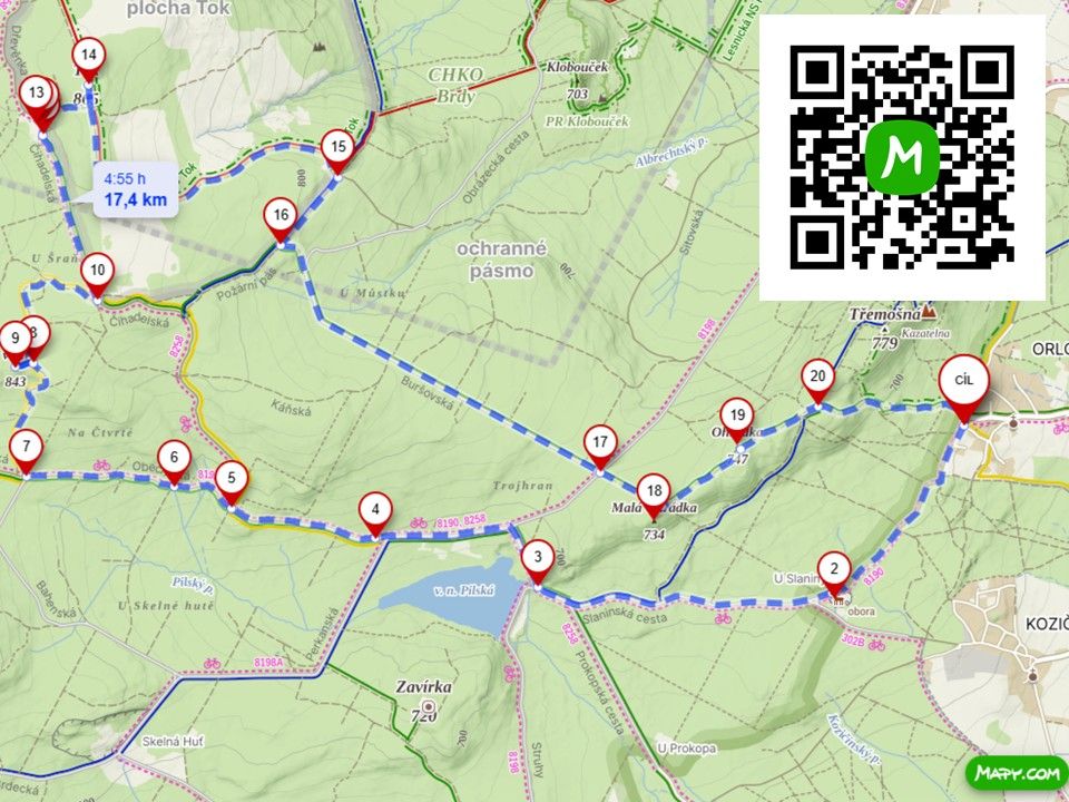 Trasa výletu: Start – parkoviště Orlov, 2 – obůrka U Slaniny, 3 – Pilská nádrž, 4 – pramen Pilka, 5 – rozcestí Na Třetí, 6 – pramen U Borské cesty, 7 – rozcestí U Ernestýnky, 8 – rozcestí Bohutínský vrch, 9 – vrchol Bohutínský vrch, 10 – rozcestí Na Čihadlech, 11 – pomník Miroslava Chlupsy, 12 – studánka U Carvánky, 13 – chata Carvánka, 14 – vrchol Tok, 15 – rozcestí Seník pod Tokem, 16 – rozcestí Pod Tokem, 17 – rozcestí Roviny, 18 – vrchol Malá Ohrádka, 19 – vrchol Ohrádka, 20 – rozcestí Nad Slaninou, cíl – parkoviště Orlov.