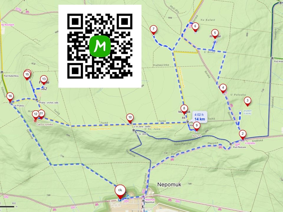 Od bývalého německého radiomajáku se vraťte zpátky na rozcestí Praha, které je u meteoradaru. Dál jděte po žluté z kopečka na rozcestí Pod Prahou. Odtud vás zelené turistické značky zavedou na autobusovou zastávku v Nepomuku, kde zahnete doprava a brzy dojdete zpátky na parkoviště.