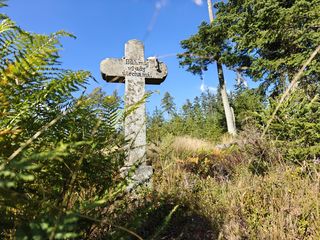 Od pramene říčky Litavky se vraťte zpátky na zpevněnou cestu a pokračujte dál do kopce. Po několika metrech budete míjet kamenný kříž s nápisem Bůh můj všudy útěcha má. Na tomto místě se před mnoha a mnoha lety málem stalo neštěstí. S lesmistrem Emanuelem Krausem se v tomto místě převrátil vůz, když se mu splašili koně. Protože se lesmistrovi naštěstí nic nestalo, nechal v místech vztyčit tento kříž jako upomínku na událost.