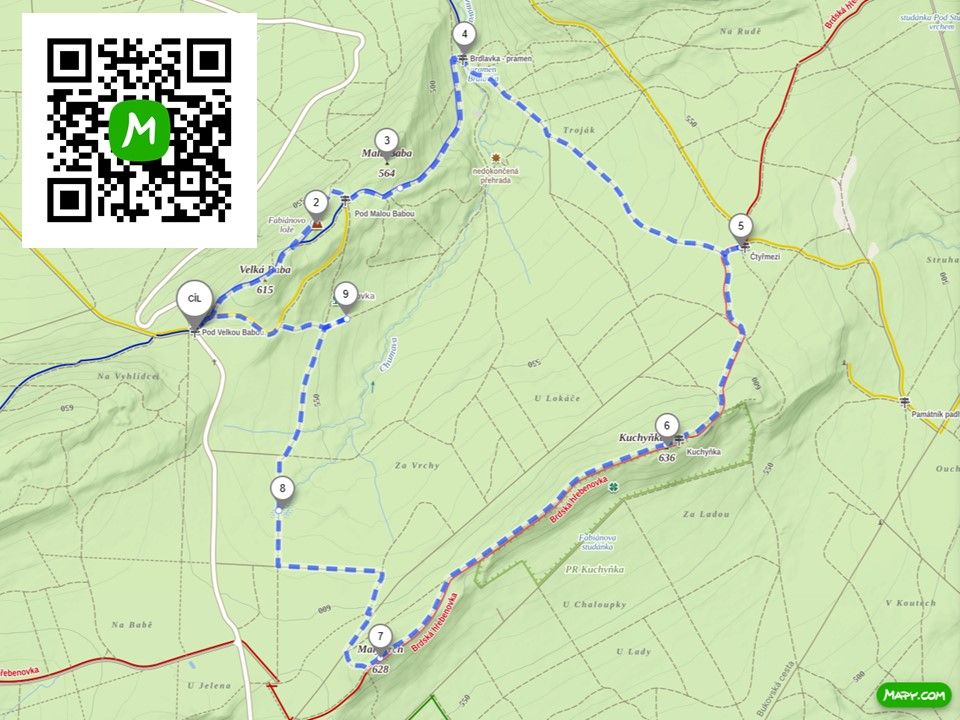 Zastavení na trase: Start - rozcestí Pod Velkou Babou, 2 - skalní útvar Fabiánovo lože, 3 - vrchol Malá Baba, 4 - pramen Brdlavka, 5 - Čtyřmezí, 6 - vrchol Kuchyňka, 7 - vrchol Malý vrch, 8 - pramen Chumavy, 9 - studánka beze jména, cíl - rozcestí Pod Velkou Babou